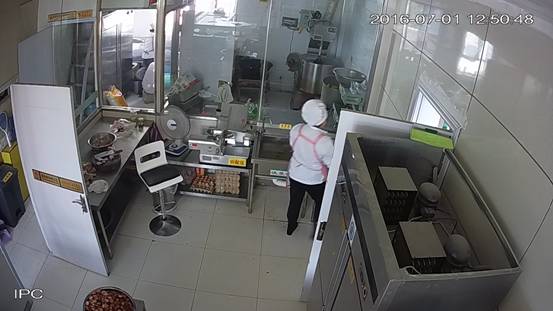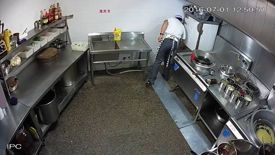博乐市聚福顺后堂,2016年7月1日上午,视频监控平台拍摄,墙面洁净、地面防滑地砖不洁,厨具、用具干净整洁。1名工作人员穿戴清洁的工作衣帽上岗。