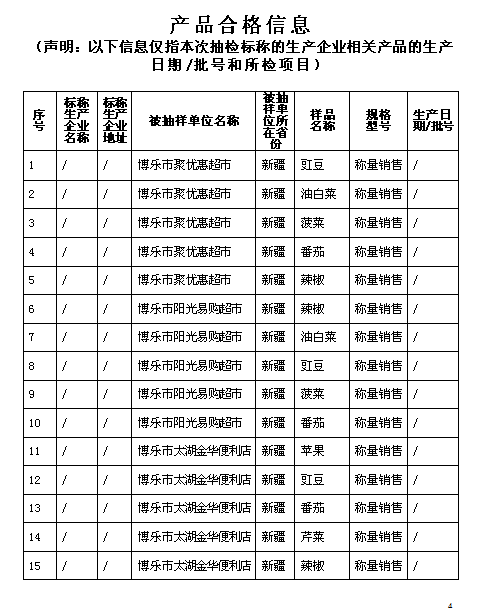 根据《中华人民共和国食品安全法》和《食品安全抽样检验管理办法》的规定,2017年8月25日博乐市市场监督管理局委托阿拉山口检验检疫局对博乐市范围内生产经营的食用农产品等3大类50批次食品进行了监督抽检。其中,食品抽检合格的样品50批次,合格率为100%,现将有关食品抽检信息予以公告,合格样品信息详见附件。