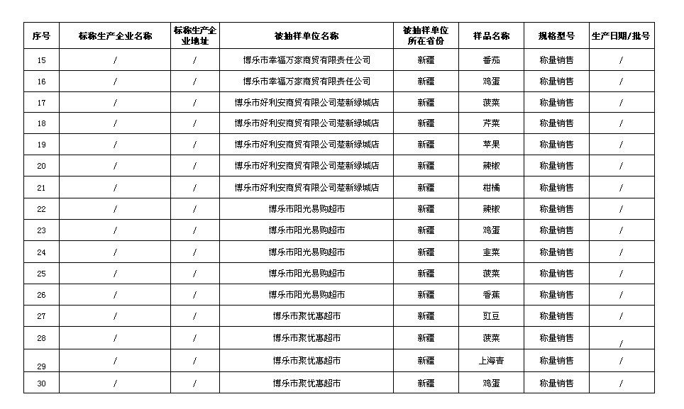 根据《中华人民共和国食品安全法》和《食品安全抽样检验管理办法》的规定,2017年4月22博乐市市场监督管理局对博乐市范围内生产经营的食用农产品等4大类30批次食品进行了监督抽检。其中,食品抽检合格的样品30批次,合格率为100%,现将有关食品抽检信息予以公告,合格及不合格样品信息详见附件。
