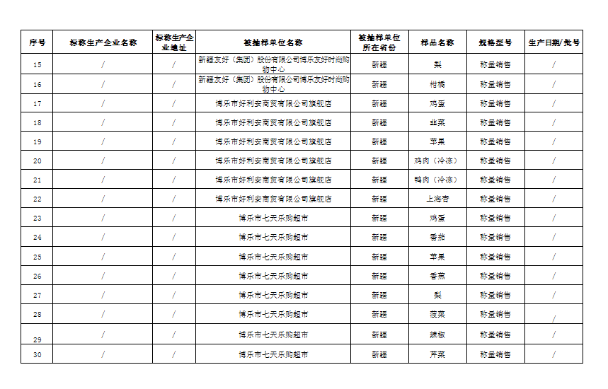 根据《中华人民共和国食品安全法》和《食品安全抽样检验管理办法》的规定,2017年4月22博乐市市场监督管理局对博乐市范围内生产经营的食用农产品等4大类30批次食品进行了监督抽检。其中,食品抽检合格的样品30批次,合格率为100%,现将有关食品抽检信息予以公告,合格及不合格样品信息详见附件。