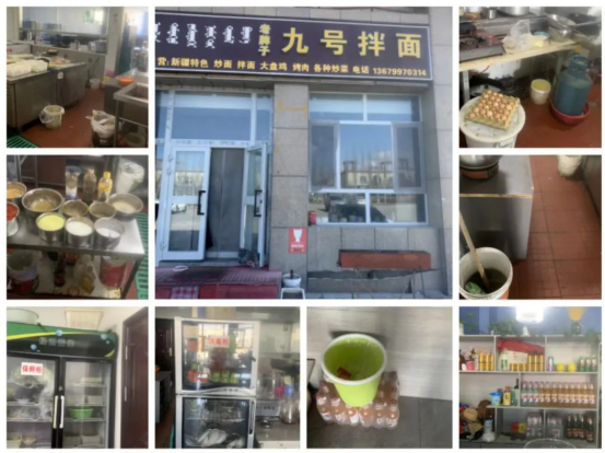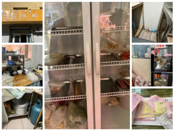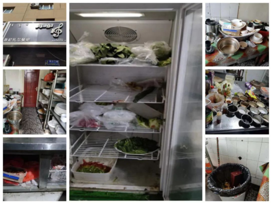 上榜理由:1.冷藏柜食品未处理,器皿未清洁直接放置冷藏柜;2.餐具未清洁处理,随意堆放;3.操作台调料摆放混乱,残留物未处理;4.冷藏柜内物品摆放混乱,异味重;5.垃圾桶未加盖儿,存在食品交叉感染风险;6.未安装“明厨亮灶”、未提供食品索证索票及进货查验记录。