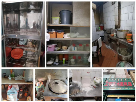 上榜理由:1.地面卫生脏、乱、差;2.食品未离地离墙摆放,与饲料添加剂混放;3.操作台污渍未处理;4.操作台面未清洁进行操作;5.柜台物品摆放混乱,餐具未消毒直接摆放;6.消毒柜未正常使用,放入餐具;7.未提供食品索证索票及进货查验记录。