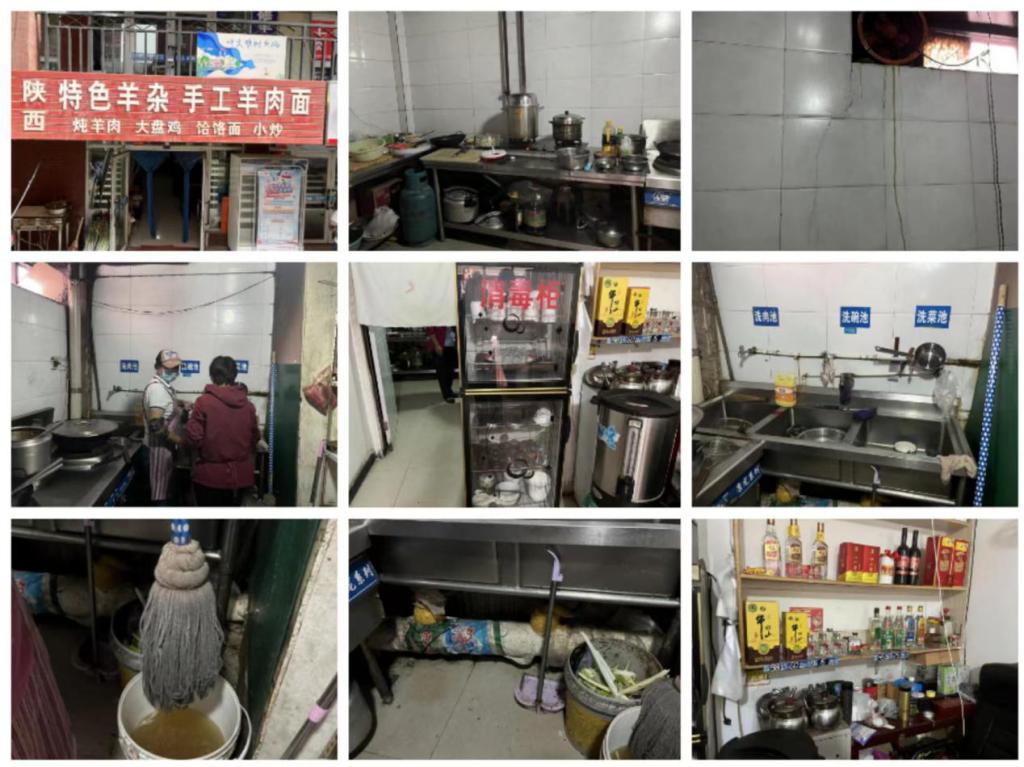 曝光理由:1.后堂卫生脏乱差;2.灶台有油污;3.工作人员未穿戴工作服、工作帽;4.消毒柜未按规定使用;5.餐具未及时清洗;6.拖把进入后堂;7.就餐区脏乱差;8.未使用带盖垃圾桶;9.食品与物品混放。