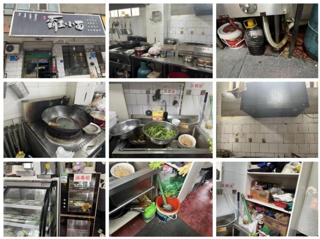 曝光理由:1.后堂卫生脏乱差;2.操作区域卫生不达标,油污重;3.食品食材与垃圾混放;4.消毒柜未按规定使用;5.清洁用工具随意摆放;6.食品与非食品混放;7.未落实制止餐饮浪费工作。