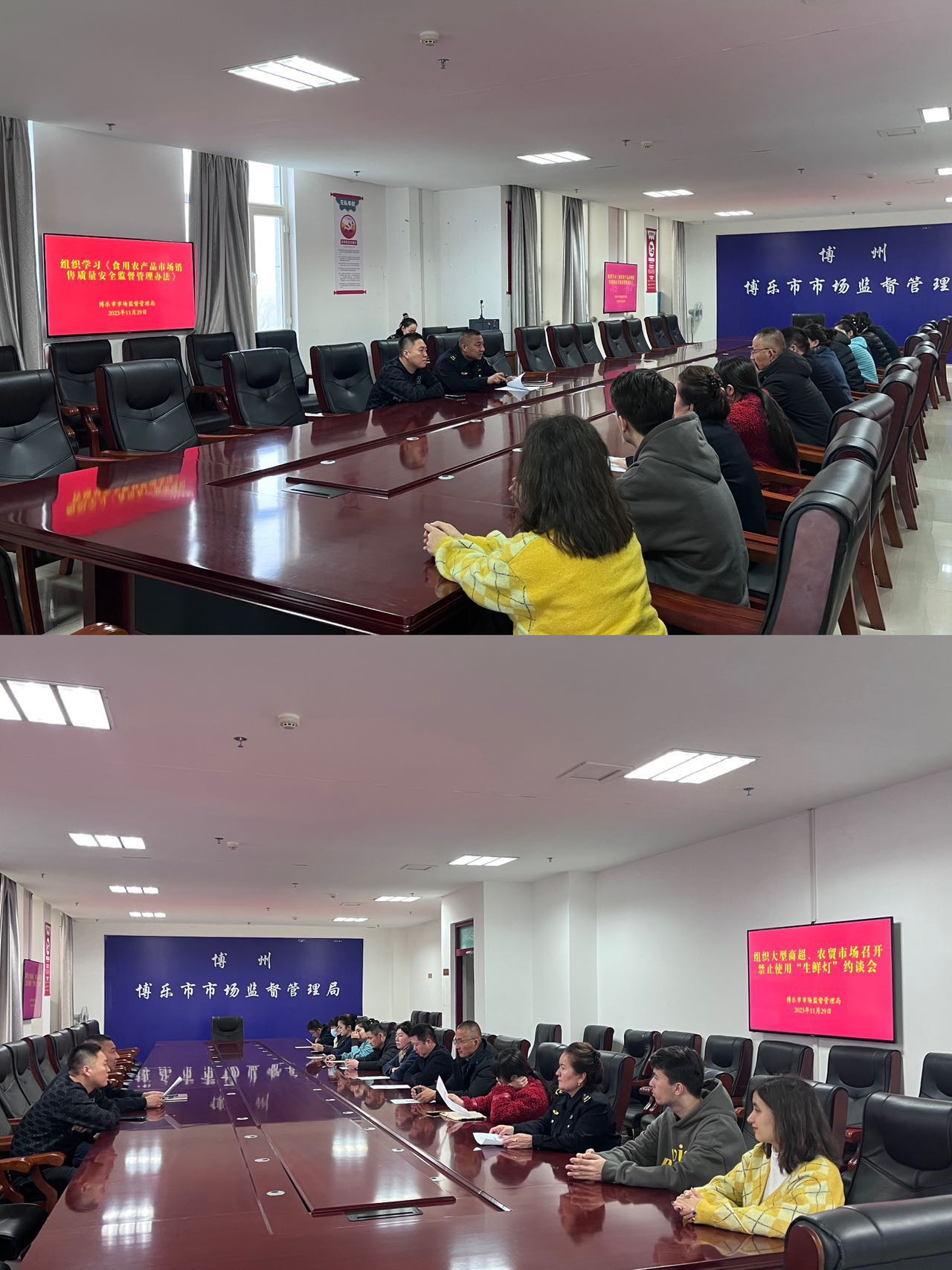 2023年11月29日,博乐市市场监督管理局组织辖区内12家大型商超、农贸市场负责人召开了禁用“生鲜灯”约谈会。