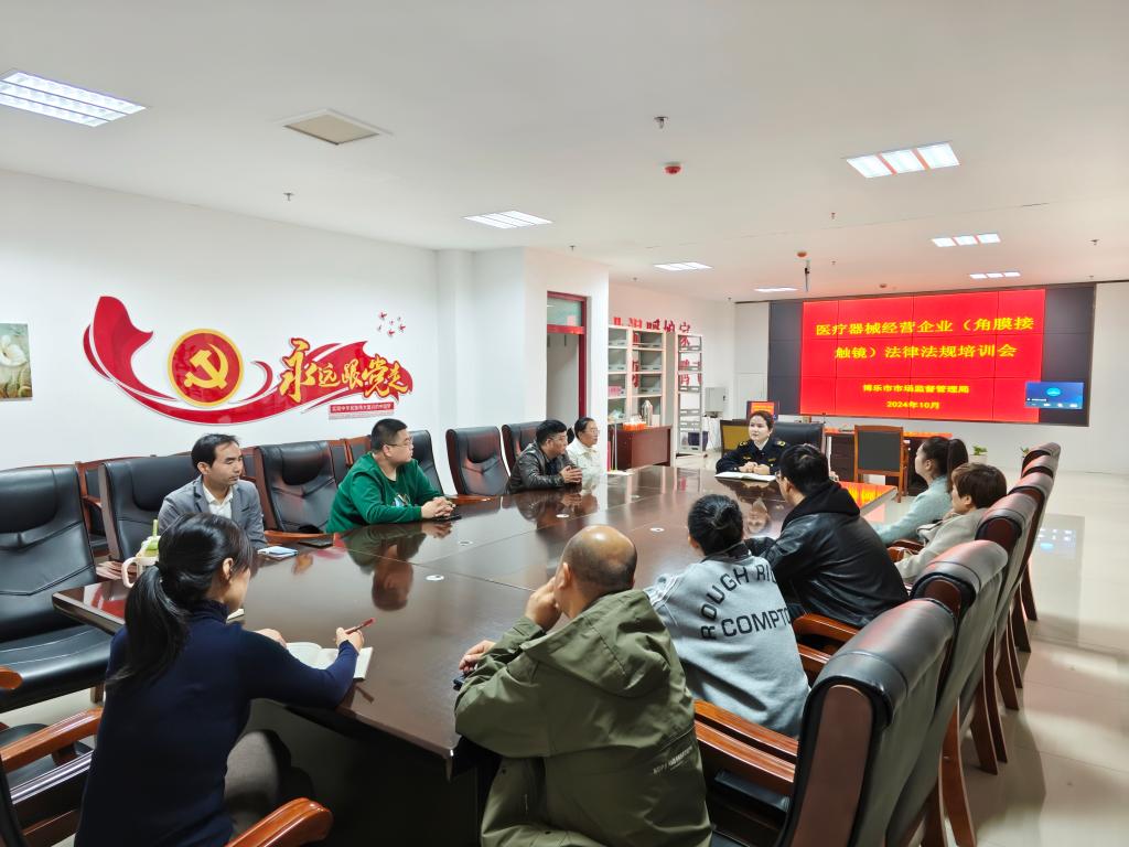 为规范硬性角膜接触镜(俗称角膜塑形镜、OK镜)及护理液等医疗器械经营行为,博乐市市场监督管理局于2024年10月29日上午,组织辖区内销售角膜塑形镜等医疗器械产品的经营企业召开了集体约谈暨法律法规培训会。