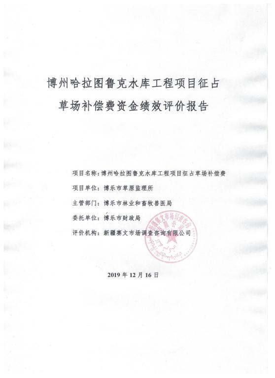 为检验博州哈拉图鲁克水库工程项目征占草场补偿费资金使用绩效,考核资金预算绩效目标的实现程度、支出效率和综合效果,进一步提高财政支出的管理水平,博乐市财政局委托新疆赛文市场调查咨询有限公司(以下简称赛文公司)作为第三方机构,按照《关于全面实施预算绩效管理的实施意见》(新党发〔2018〕30号)等文件的有关规定,对“博州哈拉图鲁克水库工程”项目资金的使用情况开展绩效评价。