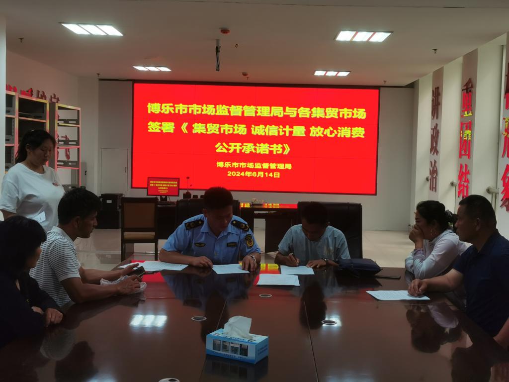 最后,博乐市市场监督管理局与各农贸市场及集贸市场负责人逐个签订了《集贸市场诚信计量放心消费公开承诺书》。