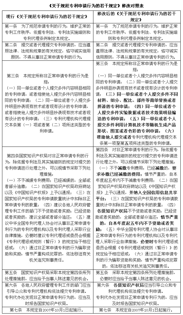据了解,和现行的《若干规定》相比,修改后的《若干规定》主要在两大方面进行了变动,一是增加了非正常专利申请的行为方式,二是加强了针对非正常专利申请行为的处理措施。