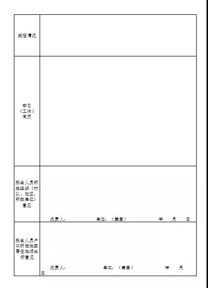 6.报名时需携带以下材料:本人近期1寸免冠照片3张;个人简历;毕业证、学历(学位)证书(原件、复印件),身份证(原件、复印件)、填写《报名表》、《政审表》。