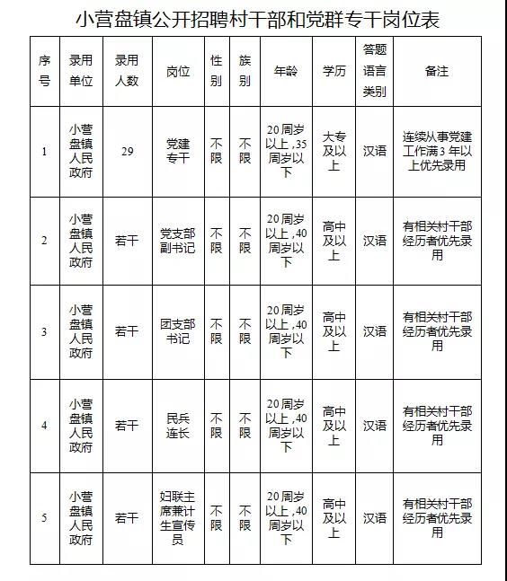 ㈡ 招聘岗位:以村为单位,计划公开招聘若干名村干部(党支部副书记、团支部书记、民兵连长、妇联主席兼计生宣传员)和党群专干若干名(具体岗位名额见小营盘镇公开招聘村干部和党群专干岗位表附件1)。