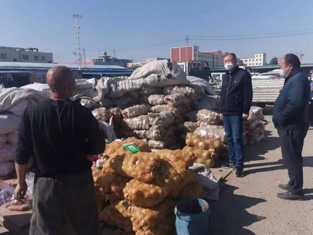 在博乐兴农果蔬批发市场,食品区执法工作人员详细查询各类菜品米面油的进货渠道和进货、售卖价格,对牛奶和冷鲜食物的生产日期进行了检查。