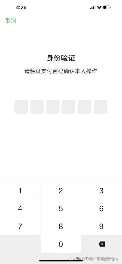 第七步:输入“微信支付密码”,进行身份验证;