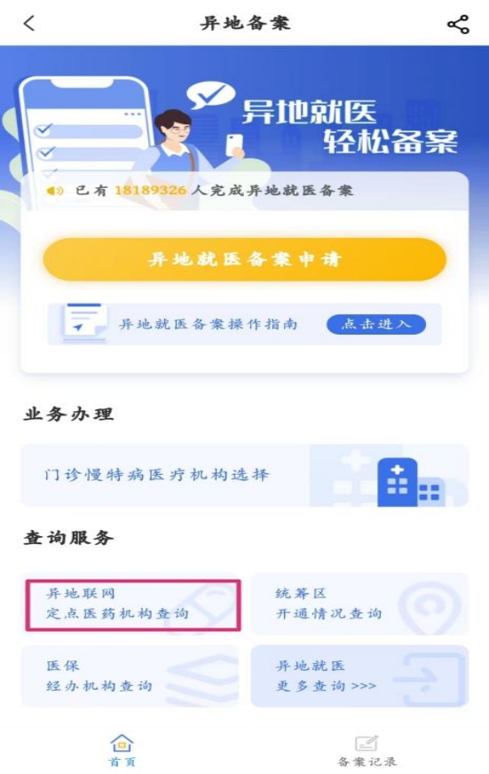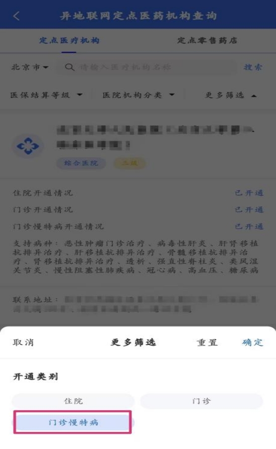 您可登录国家医保服务平台APP,在“异地备案”服务专区,点击查询服务下的“异地联网定点医药机构查询”,选择就医地,输入定点医疗机构名称,查询定点医疗机构门诊慢特病结算开通情况及支持病种;也可以点击“更多筛选”,在“开通类别”中选择门诊慢特病,查询就医地开通的所有门诊慢特病费用跨省联网定点医药机构。