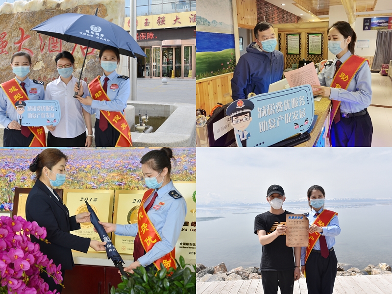 近期,国家4A级风景区赛里木湖碧海蓝天、湖光潋滟,百花齐放,焕发出了勃勃的生机,吸引着天山南北的游客驻足。博乐市税务局以旅游相关产业的逐步复苏为契机,开展“税月有你 风雨同行”系列宣传活动,面向辖区内住宿业纳税人在疫情期间符合的各项税收政策进行深一轮宣传辅导,并向纳税人送上“税务小蓝伞”,寓意“阴霾终将消散 税务蓝与您同在”。