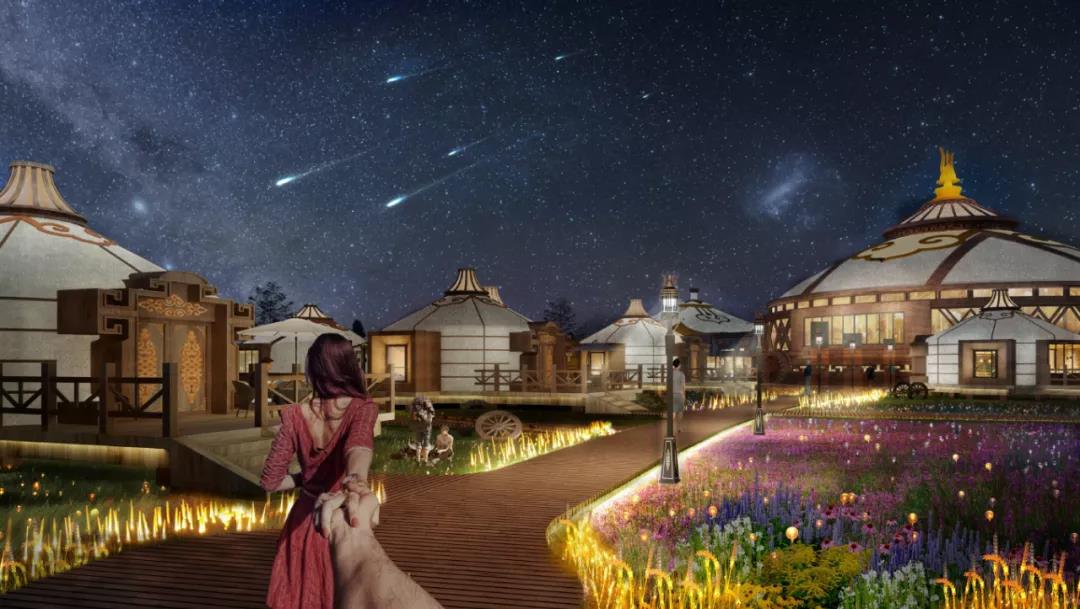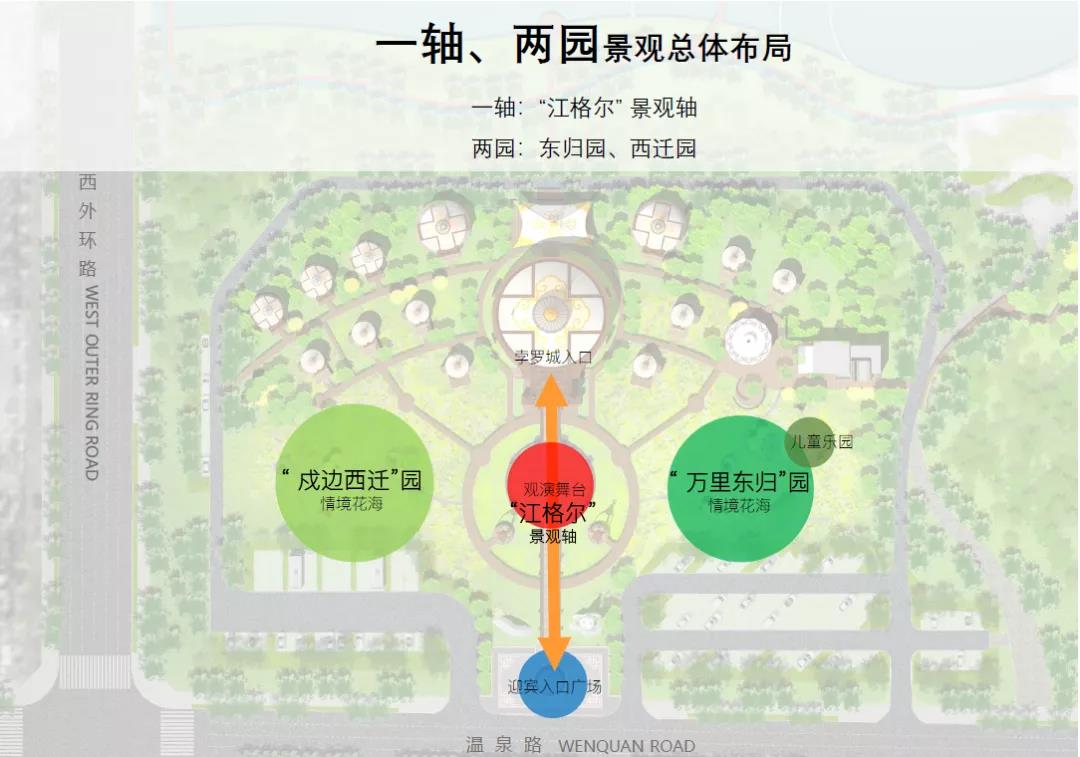 孛罗大营为帐篷营地,主要建设风格以蒙古族传统文化为基础,景区建设以“一轴、两园”为总体布局,“一轴”为江格尔景观轴,“两园”为东归园、西迁园,景区内包含:就餐蒙古包、奶茶铺、演绎舞台、观演台、文化科普带、景观花海、木栈道、儿童活动场地。