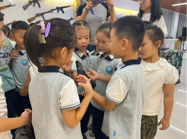 当看到逼真的坦克、飞机、导弹、航天器等模型时,小朋友们的眼睛里闪烁着惊喜的光芒,亲身体验了射击的操作,在模拟的情境中感受战士们保家卫国的英勇与决心。