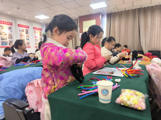 在DIY环节,孩子们热情高涨,迫不及待地领取材料包和工具,开始发挥自己的创造力。在工作人员的耐心指导下,他们巧妙运用发箍、扭扭棒、毛球等材料,通过扭、绕、弯、粘等手法,精心制作出一个个绚丽多彩、独具特色的戏曲发箍。制作完成后,孩子们兴奋地戴上自己的作品,互相欣赏、拍照留念,现场充满欢声笑语,洋溢着对传统文化的热爱与探索热情。