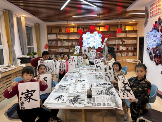孩子们聚精会神地听着,认真模仿老师的动作,一笔一划书写着。在老师的耐心指导下,一副副寓意吉祥的春联逐渐成型。志愿者们则在一旁帮忙将写好的对联摆放整齐、晾干。学生夏美琪兴奋地表示:“我要把自己写的对联带回家,贴在门上,让家里充满年味。”