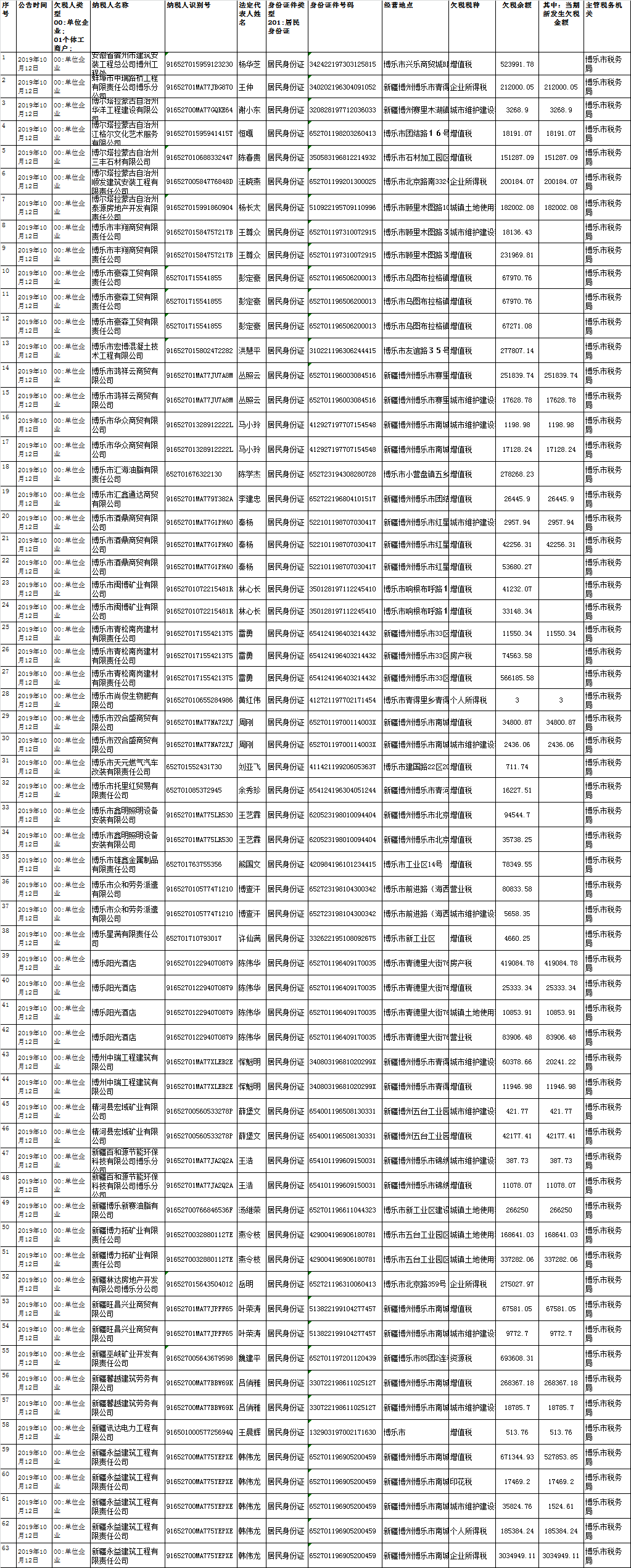 根据《中华人民共和国税收征收管理法》(中华人民共和国主席令第49号)、《中华人民共和国税收征收管理法实施细则》(国务院令第362号)和《欠税公告办法(试行)》(国家税务总局令第9号)的规定,现将博乐市税务局确认的37户纳税人欠税情况予以公告。被公告的纳税人应当及时缴清所欠税款,如拒不缴纳,采取转移、隐匿其应纳税的商品、货物以及其他财产手段妨碍税务机关追缴欠税的,税务机关将依法予以处罚;构成犯罪的,移送司法机关追究刑事责任。