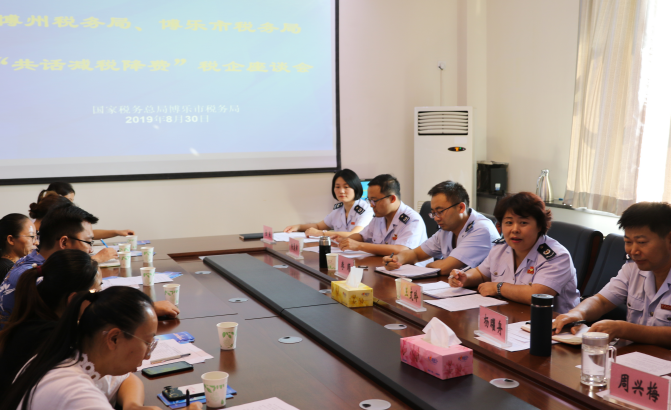 2019年8月30日,博乐市税务局召开博州税务局、博乐市税务局“共话减税降费”座谈会。博州税务局纳税服务科科长王文玲、博乐市税务局党委委员、副局长杨曜舟、李顺、部分业务股室负责人以及辖区重点企业、税负上升企业、涉税专业服务机构人员共18人参加此次会议。