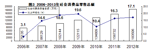 社会消费品零售总额18.35亿元,较上年增长17.1%。按销售单位所在地分,城镇17.1亿元,较上年增长17.2%;乡村1.25亿元,较上年增长14.9%。按行业分,批发业2.95亿元,较上年增长36.2%;其中:限额以上企业(单位)2.88亿元,较上年增长36.9%;限额以下企业(单位)及个体户0.07亿元,较上年增长14.7%。零售业13.35亿元,较上年增长13.6%;其中:限额以上企业(单位)0.91亿元,较上年增长6.4%;限额以下企业(单位)及个体户12.44亿元,较上年增长14.1%。住宿0.22亿元,较上年增长44.9%。其中:限额以上0.19亿元,较上年增长51.1%。限额以下0.03亿元,较上年增长14.4%。餐饮业1.84亿元,较上年增长14.5%。
