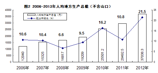 全市地区生产总值127.33亿元,较上年增长21.8%。地方生产总值(不含山口)63.69亿元,较上年增长22%。其中:第一产业增加值16.49亿元,较上年增长6.2%;第二产业增加值17.88亿元,较上年增长38%;第三产业增加值29.33亿元,较上年增长24.2%。按常住人口计算,人均地方生产总值(不含山口)为37290元。三次产业结构由上年的30.1∶25.8∶44.1调整为25.9:28.1:46。