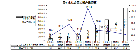 2016年,博乐市固定资产投资累计完成167.23亿元,增长21%。其中,第一产业完成投资3.87亿元,减少19.7%,占全部投资的2.3%;第二产业完成投资59.71亿元,增长39.9%,占全部投资的35.7%;第三产业完成投资103.65亿元,增长14.3%,占全部投资的62%。