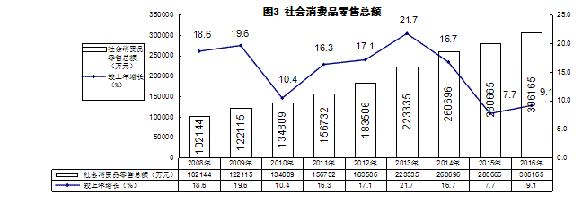 社会消费品零售总额30.62亿元,增长9.1%。按销售单位所在地分,城镇27.4亿元,增长9.1%;乡村3.22亿元,增长8.6%。按行业分,批发业3.49亿元,减少13.1%;其中:限额以上企业(单位)3.38亿元,下降13.7%;限额以下企业(单位)及个体户0.11亿元,增长8.6%。零售业23.81亿元,增长13.3%;其中:限额以上企业(单位)5.1亿元,增长34.6%;限额以下企业(单位)及个体户18.71亿元,增长8.6%。住宿0.31亿元,增长17.7%。其中:限额以上0.26亿元,增长19.3%;限额以下0.04亿元,增长8.6%。餐饮业3.01亿元,增长8.6%。