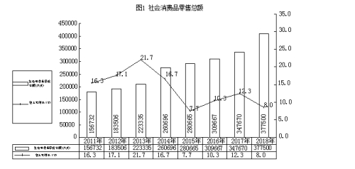 2018年,社会消费品零售总额达37.75亿元,同比增长8%。按销售单位所在地分,城镇34.17亿元,同比增长7.97%;乡村3.57亿元,同比增长8.46%。按行业分,批发业8.85亿元,同比增长28.72%;其中:限额以上企业(单位)8.71亿元,同比增长29.01%;限额以下企业(单位)及个体户1346.2万元,同比增长12.45%。零售业25亿元,同比增长2.03%,其中:限额以上企业(单位)2.52亿元,同比下降36.67%;限额以下企业(单位)及个体户22.49亿元,同比增长9.52%。住宿2677.7万元,同比下降12.46%。其中:限额以上2131.7万元,同比下降16.79%;限额以下545.9万元,同比增长9.84%。餐饮业3.62亿元,同比增长11.24%。