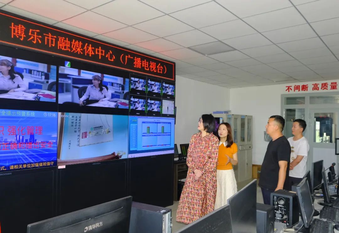 柳莺一行实地参观了博乐市融媒体中心的软硬件设备建设情况,详细了解中心近年来在技术改造、全媒体平台搭建及对外宣传等方面的发展成果,随后与博乐市委常委、宣传部部长尹璐、博乐市融媒体中心(广播电视台)干部座谈交流,并认真听取了援疆记者代表王纲的工作汇报。
