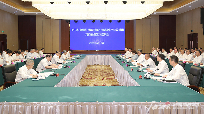 7月18日,浙江省·新疆维吾尔自治区及新疆生产建设兵团对口支援工作座谈会在阿拉尔市召开。石榴云/新疆日报记者 崔志坚摄
