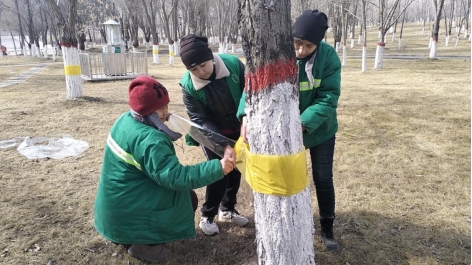 公园园林工人因地制宜,针对春季易发的春尺蠖、蚜虫等虫害,采取刷涂树干、缠“黄腰带”(黄色黏虫胶带)的物理防治方法,该方法对来源于地下需要迁移上树的虫害防治效果可达90%以上。针对锈病、白粉病等病害,采用高效低毒生物制剂,进行全园喷雾防治,有效遏制植物病虫害的生长和扩散,截至目前已完成6000余棵树木缠“黄腰带”防治工作。