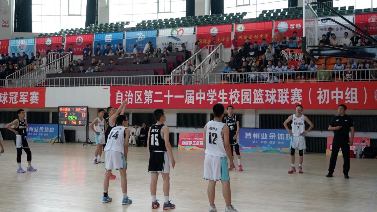 随着抛球划破长空,自治区第二十一届中学生校园篮球联赛(初中组)正式拉开帷幕。各参赛队伍迅速进入状态,在球场上展开激烈争夺。赛场上,球员们你争我夺,快速的攻防转换、精准的三分远投、默契的团队配合等精彩表现不断,引爆现场气氛,观众席上欢呼声、掌声此起彼伏。