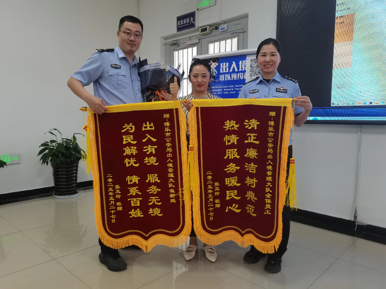 在博乐市行政服务中心出入境证件受理窗口,近日发生了温馨的一幕。一位群众满怀感激之情,将两面鲜艳的锦旗送到民警手中,锦旗上“出入有境 服务无境,为民解忧 情系百姓”、“清正廉洁树典范,热情服务暖民心”的烫金大字,在阳光的映照下熠熠生辉,格外醒目,这也成为了出入境管理大队优质服务的生动见证。
