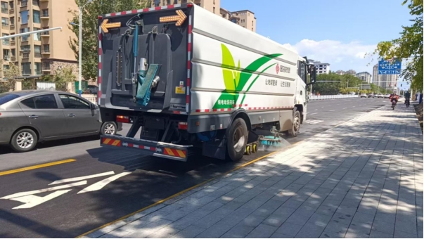 在作业安排上,科学统筹、精心部署,调配6辆洒水车依据气温和路况科学规划作业,对市区重点路段开展不间断巡回洒水,从源头抑制扬尘。同时,采用“7辆小型高压冲洗车深度水洗+12辆机械清扫车清理泥沙+3辆洒水抑尘车巩固效果”的协同模式,实现道路扬尘治理全流程覆盖。此外,还安排洒水车对树木、绿篱和路面进行喷洒,既为绿植补充水分,又进一步净化空气,为周边居民打造洁净的生活空间。