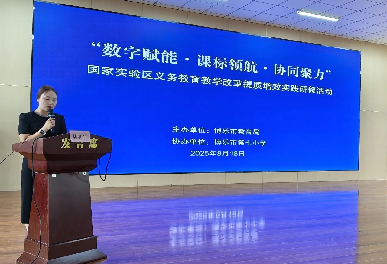 2025年8月18日至19日,博乐市教育局以“数字赋能·课标领航·协同聚力”为主题,在第七小学主会场及各教育集团核心校分会场,开展了国家实验区义务教育教学改革提质增效实践研修活动。这场集结了全市教育力量的研修,不仅是一次教学经验的碰撞,更是推动义务教育改革向深向实的有力举措。