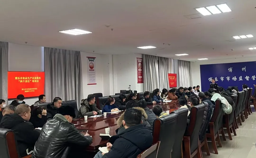 为进一步推动食品安全“两个责任”工作机制落地落实,提高食品生产企业的主体责任意识和包保干部的监管能力,促进食品产业健康发展。2025年1月7日博乐市市场监督管理局组织召开了一场全面而深入的食品安全“两个责任”培训。此次培训由食品生产企业负责人、食品安全总监、食品安全员以及包保干部共计90余人参加。