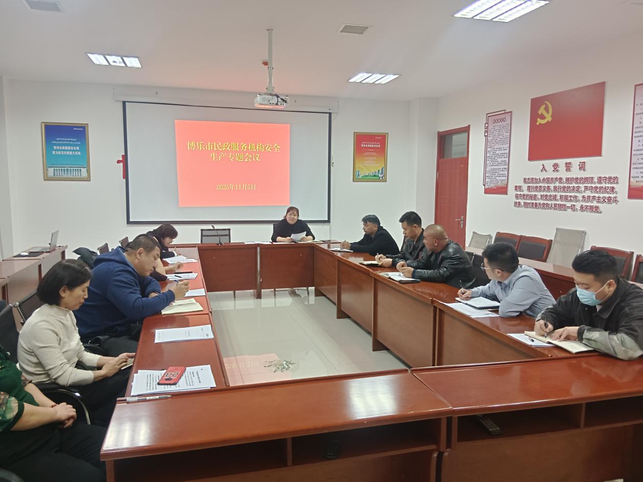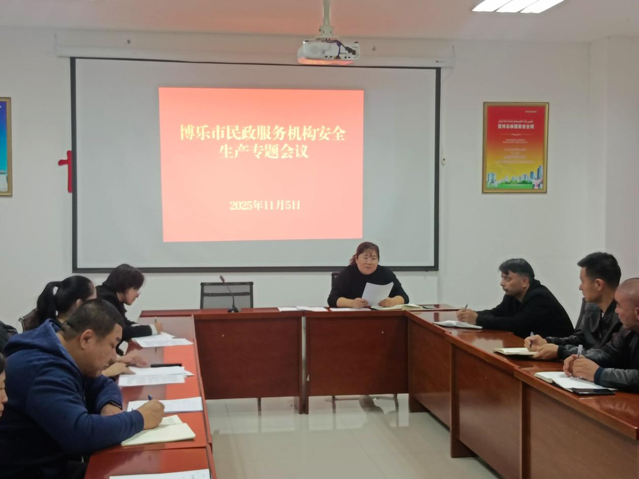 2025年11月5日下午,博乐市民政局组织各民政服务机构负责人召开安全生产专题会议及警示教育工作会议。市民政局局长袁圆领学了民政部关于《切实采取过硬措施坚决防范遏制养老机构重特大火灾事故》的通知、领学自治区民政厅关于《全区养老机构安全风险隐患“体检式”专项排查整治工作实施方案》、警示约谈会精神等资料。会议通过案例警示、政策解读、交流部署等环节,达到了统一思想、压实责任、明确方向的预期目标。
