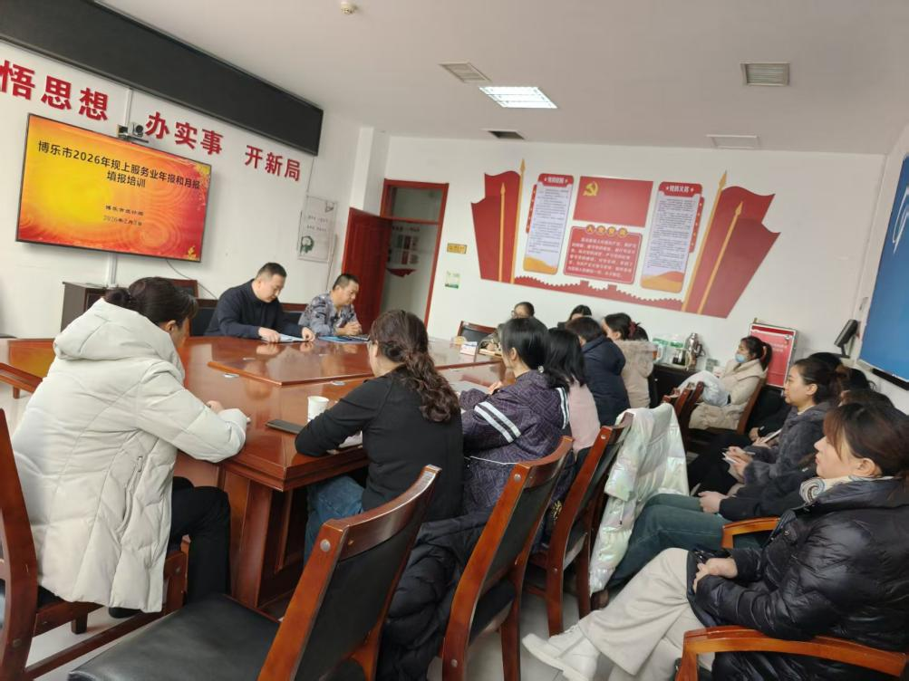 为扎实推进2026年规模以上服务业统计年报及定期月报工作,提升统计数据质量与企业统计人员业务水平,2月4日,博乐市统计局召开全市规模以上服务业企业统计年报月报专题培训会。各相关企业的统计负责人及业务骨干共20余人参训。