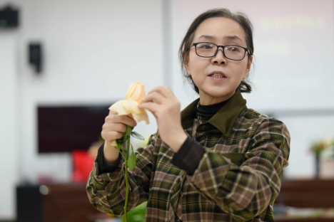 随后,插花艺术体验活动拉开帷幕,活动特别邀请花艺老师现场授课指导。老师结合自身丰富的花艺经验,从花材选择、色彩搭配、枝叶修剪、造型设计等方面进行细致讲解,深入浅出地传授插花技巧与美学知识,现场演示了基础插花造型的制作过程。
