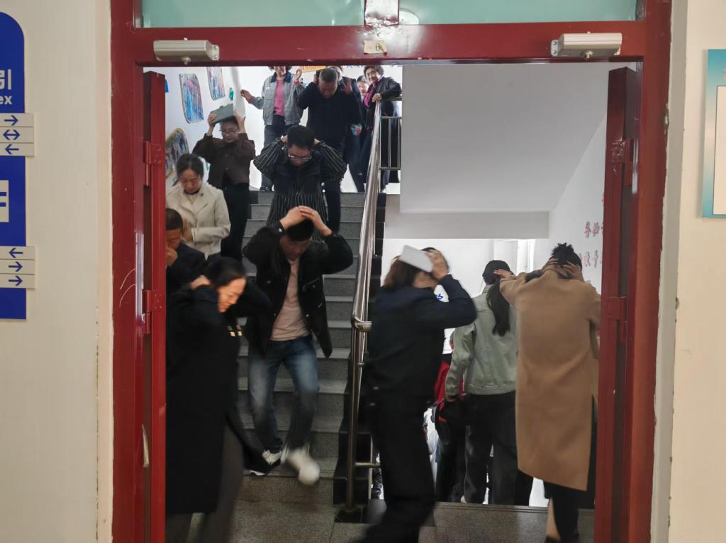 培训结束后,现场随即开展地震消防应急疏散演练。随着警报响起,全体参训人员严格按照预案要求,双手护头、快速避险,在工作人员引导下沿预定路线弯腰低姿、有序撤离至办公区空旷安全区域,全程紧张有序、规范高效,无拥挤、无掉队。演练完成后,教官对流程进行复盘点评,进一步优化疏散路线、明确岗位职责,切实提升干部职工应对突发地震和消防灾害的快速响应与协同处置能力。