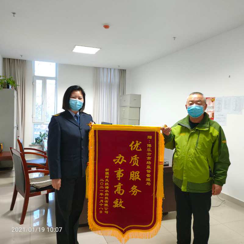 2021年1月19日上午,新疆阿夫拉姆水科技有限公司企业负责人将一面“优质服务办事高效”的锦旗送到博乐市市场监督管理局食品科处,对食品科工作人员及时现场审核和热情服务表示感谢。