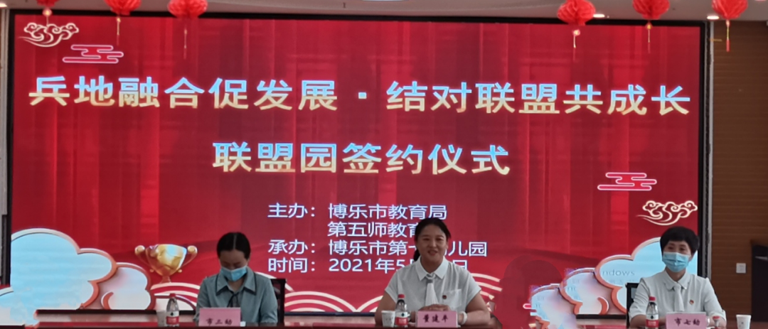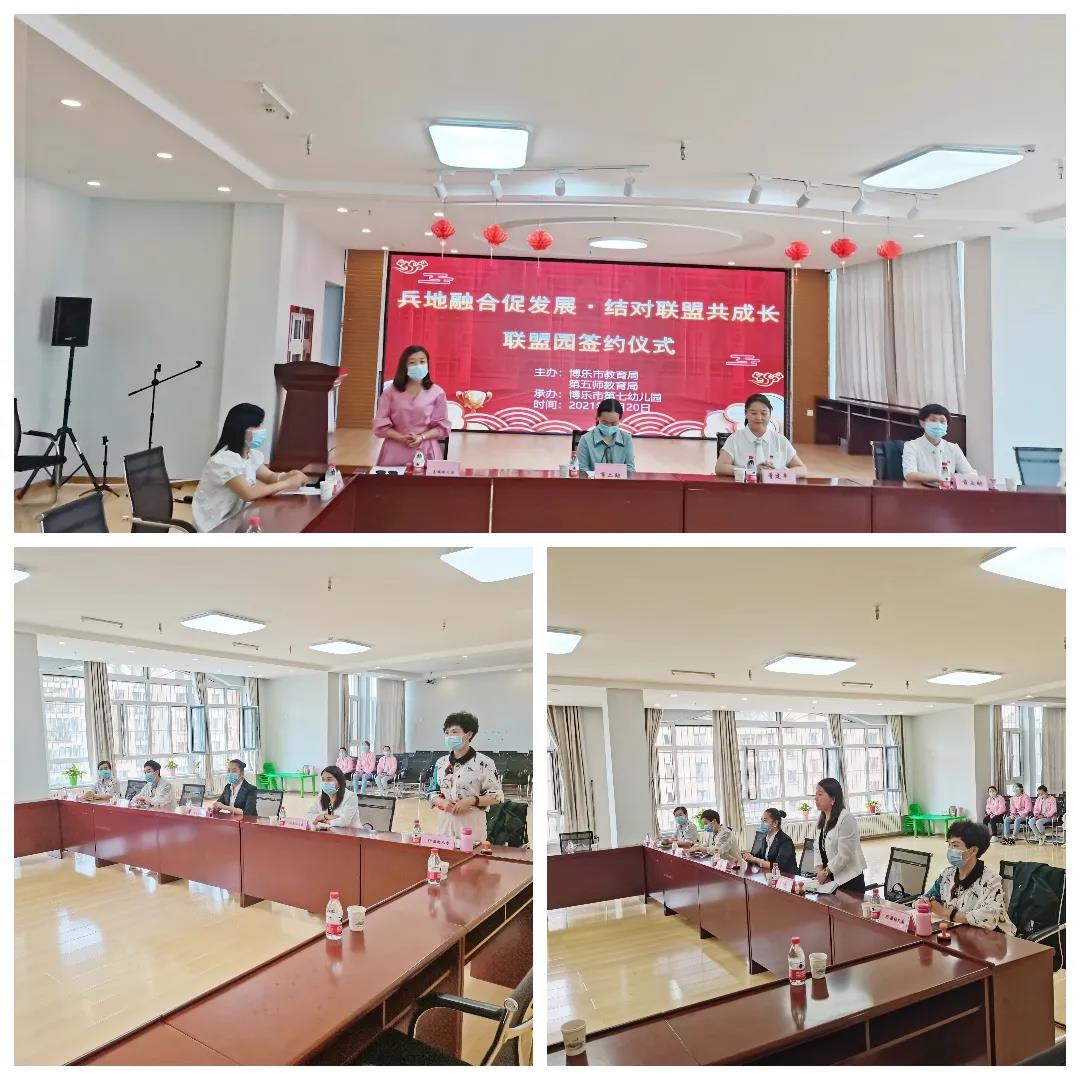 为全面贯彻党的十九大和十九届二中、三中、四中、五中全会精神,深入贯彻落实习近平总书记关于新疆工作、兵团工作的重要讲话和重要指示精神,贯彻落实以习近平同志为核心的党中央关于兵地融合发展的决策部署,贯彻落实第三次中央新疆工作座谈会精神,牢固树立兵地“一盘棋”思想,深入推进兵地教育的融合。5月20日上午,在博乐市第七幼儿园园所内,博乐市第二幼儿园、博乐市第六幼儿园、博乐市第七幼儿园、博乐市乌图布拉格幼儿园、博乐市达勒特幼儿园分别和第五师八十六团新世纪幼儿园、第五师八十一团幼儿园、第五师八十四团幼儿园、第五师八十六团童心幼儿园、第五师八十九团幼儿园进行结对联盟签约仪式。