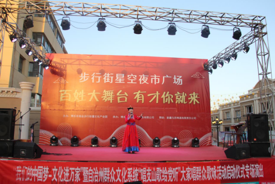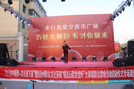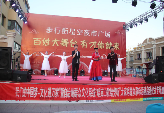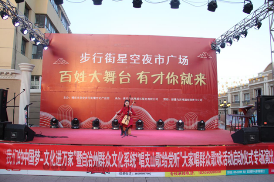 百年征程波澜壮阔,百年初心历久弥坚。为迎接中国共产党百年华诞,大力营造“党的盛典、人民的节日”团结奋进、开创新局的浓厚社会氛围,在州市文旅局的指导下,5月25日晚,在博乐市商业步行街百姓大舞台,由博州文化馆、博乐市文化馆联合举办的我们的中国梦·文化进万家暨群众文化系统“唱支山歌给党听”大家唱群众唱歌咏文化活动启动仪式。庆祝中国共产党成立100周年群众文化系列活动 。活动通过大合唱演唱、器乐马头琴演奏、舞蹈等艺术形式,引导广大群众以文艺的形式献礼中国共产党百年华诞。