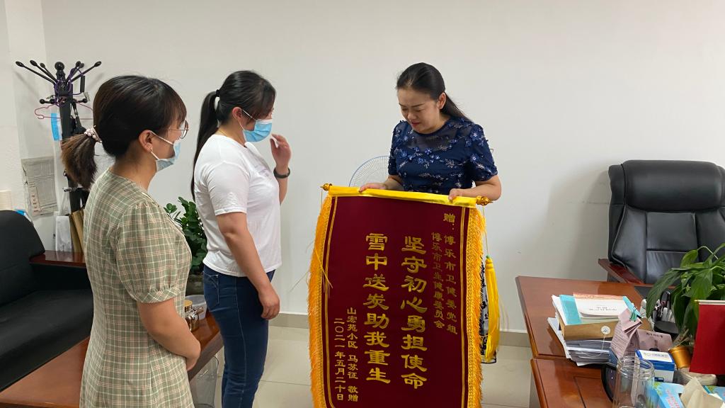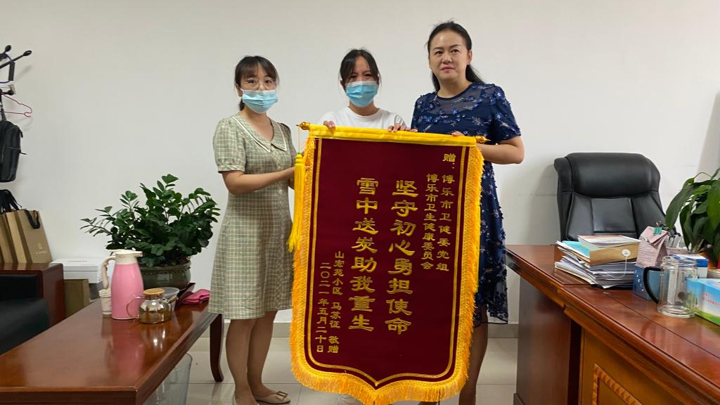 6月3日,一面绣有“坚守初心勇担使命 雪中送炭祝我重生”的锦旗,由博乐市个体诊所医生马苏征的妻子王红送到博乐市卫健委主任汪澎的手中,以此感谢博乐市卫健委对其丈夫生病期间救助感激之情。