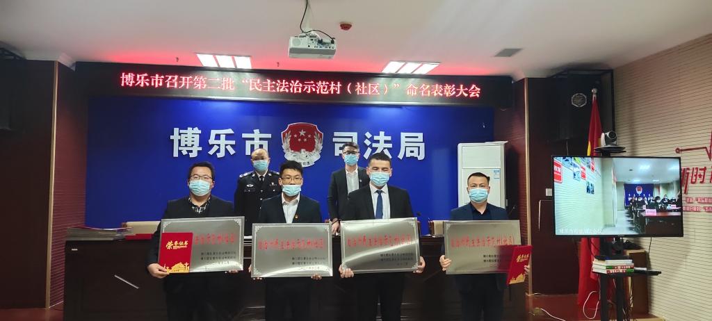 表彰会上,博乐市民政局党组成员、局长哈斯特宣读了《关于命名第二批“博乐市民主法治示范村(社区)”的决定》并现场对命名表彰的小营盘镇贝德布拉格村、阿热勒托哈村、青得里镇昂崩那巴格村、乌图布拉格镇巴亚尔布拉格西村、贝林哈日莫墩乡吉翁村、达勒特镇达勒特西村等20个民主法治示范村(社区)进行了授牌仪式。