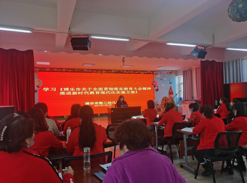 2022年1月6日,博乐市第二幼儿园认真组织全体教职工进行集中学习,学习的主要内容有《博乐市关于全面贯彻落实大会精神推进新时代教育现代化实施方案》、《自治州加强和规范中小学校党组织领导下的校长负责制实施办法》、《博乐市教育系统2021-2025年发展党员工作规划》《关于建立中小学校党组织领导的校长负责制的意见》等文件,同时观看了《2021年开学第一课》《感动中国人物——张桂梅》《对话》《最美校长妈妈——张桂梅》等一系列深入人心的视频。通过文件的学习,我们新时代幼儿教师需要做的是坚持把立德树人放在首位,以树人为核心,以立德为根本,培养体智得美劳全面发展的社会主义建设者和接班人。