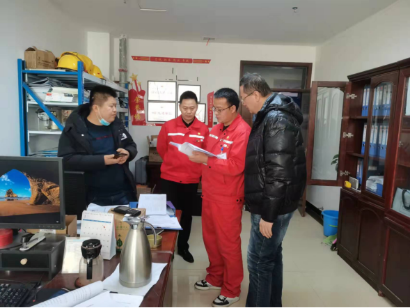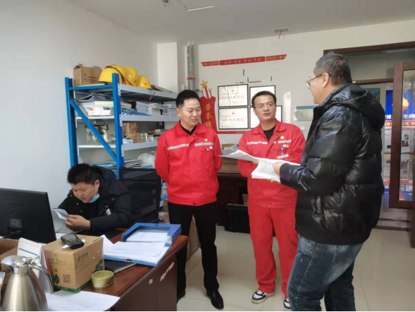 图为在查阅相关档案后,对保障燃气输送管道等设备维修、巡检开展情况进行交流,最大程度保障用气安全,民用气安全。