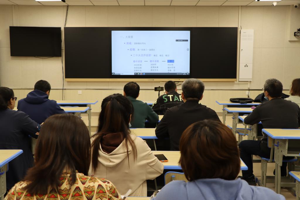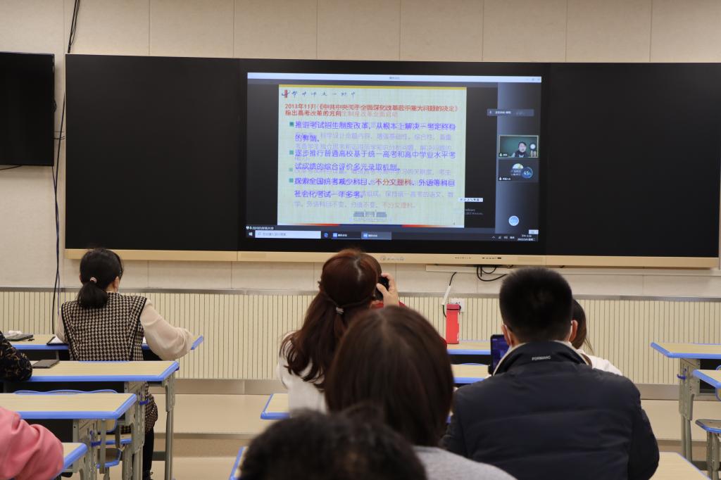 华中师大一附中政治教研组长项俊做《踏石留印巧抓实干——2022高考政治备考漫谈》讲座。项老师分析了2021年高考全国乙卷的命题特点,表示命题中厚植爱党爱国爱社会主义情感、凸显党的创新理论,且加强试题情境设计,考试内容集中于学科主干上;并精讲了高考真题,对重要时事热点做了分析。